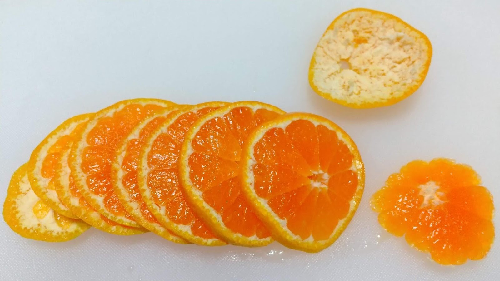 みかんはよく洗って水気をしっかり拭いておく。薄切りにして、それから皮を剥く。