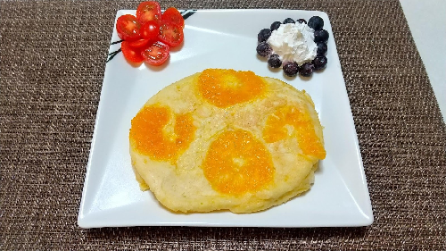 フライパンを中火で熱する。今回はテフロン加工のフライパンを使用したので油をしいていないが、そうでない場合は薄く油(分量外)をしいておこう。最初にみかん半量をフライパンに入れてそれから生地を半量流し込む。弱火で蓋をして5分程度焼く。気泡ができてきたらひっくり返して、さらに弱火で4分焼く。中がきちんと焼けているか確認して、大丈夫ならお皿にとろう。残りのみかんと生地で、同じものをもう1枚焼けば完成だ。