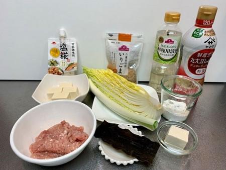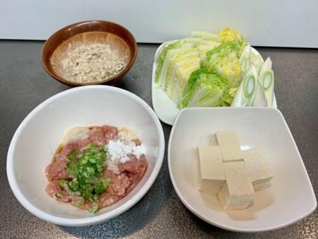 ボウルに鶏ひき肉、ネギ、片栗粉、塩麴、そのほかの調味料をすべて入れる。豆腐、白ネギ、白菜は食べやすい大きさに切っておく。