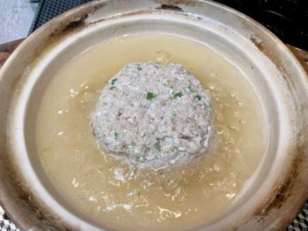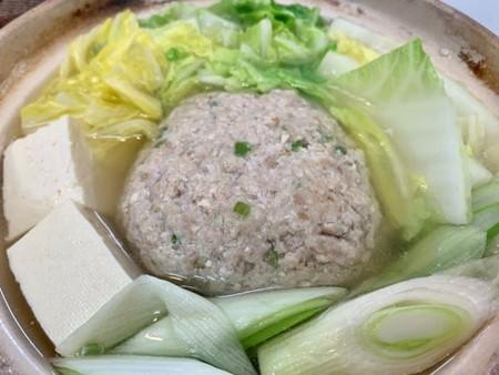 鶏だんごの周りに白菜や豆腐を入れ、少し火を強めて煮立てる。だんごはスプーンですくって小鉢に移し、野菜類が煮えたらスープと共にいただく。