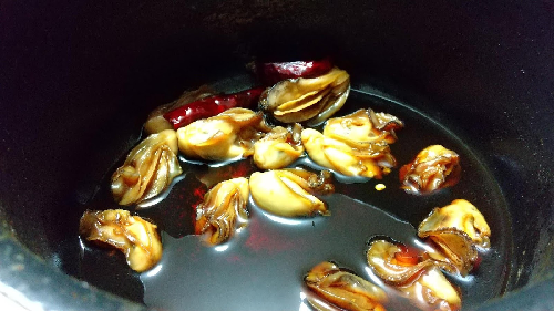 鷹の爪と、みりん以外の調味料を入れて煮立たせる。そこに牡蠣を入れて3分程度中火でふたをして煮る。