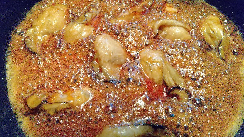 みりんを入れて一度煮立たせたらすぐに火を消す。余熱で味がしみこむように鍋をふりながら冷ます。牡蠣を取り出して、煮汁を煮詰める。
