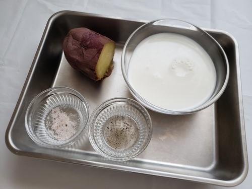 焼きいもは皮をむいておく。焼きいもを一口大にしてボウルに入れ、スプーンでよくつぶす。