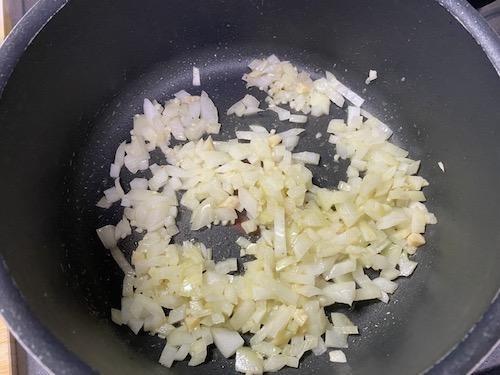 玉ねぎはみじん切りにする。鍋に油(分量外)を熱し、中火で玉ねぎを炒める。