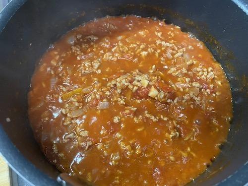 合挽き肉に火が通ったら、トマト缶、ケチャップ、中濃ソース、砂糖、チキンコンソメを加える。弱火で、汁気がなくなるまで煮詰める。