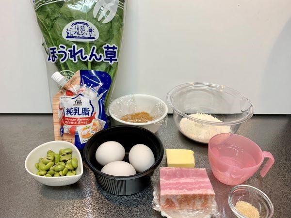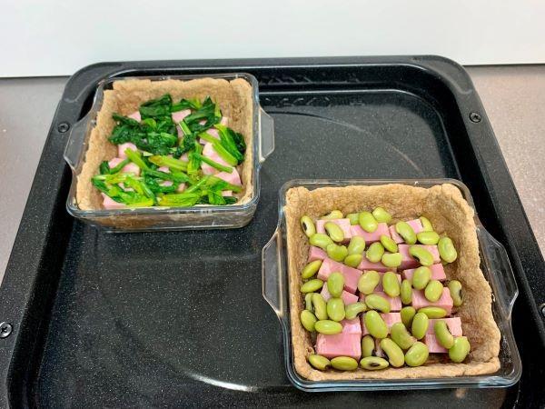 青大豆は一晩水につけて戻し、たっぷりの熱湯で10分間、あらかじめ茹でておく。豆の缶詰や蒸し豆を利用してもよい。ほうれん草は食べやすい大きさに切ってからざるに入れ、熱湯を注いで火を通しておく。ベーコンは厚さ1cm×長さ2cmに小さく切っておく。材料のサイズのブロックから計36個取れるので半分(18個)ずつ器に並べ、次に豆、ほうれん草を乗せ、最後に卵液を静かに注ぐ。