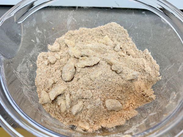 大きなボウルに薄力粉、煎りぬか、塩、砂糖を入れてよく混ぜ、冷たい有塩バターを加えたらフォークで崩しながらざっと混ぜる。バターが大体混ざったらサラダ油を加え、まな板の上に移して水を少しずつ加えながら練る。所要時間は5分程度。バターが溶けないうちに手早く作業する。