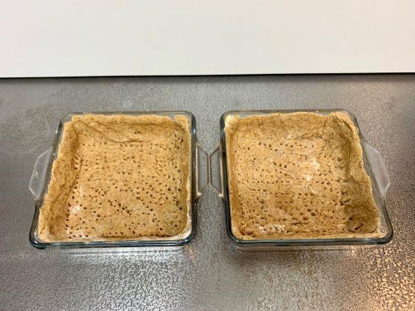 まな板の上に中力粉か強力粉(分量外)少々を振っておく。パイ生地をまな板の上に置き、全体を半分に分けてからめん棒で3mmの厚さにのばす。2つの器に写真のように敷き込み、フォークで穴を開けておく。オーブンを200℃に予熱し、上段で7分焼いて取り出す。