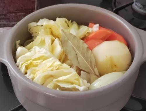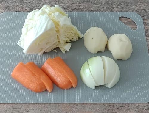 具材をカットしていく。キャベツはざっくり6~8等分に、じゃがいもは皮をむいて半分にカットする。人参も同様に皮を剥いて半分、または1/4にカットする。玉ねぎはくし切りにする。