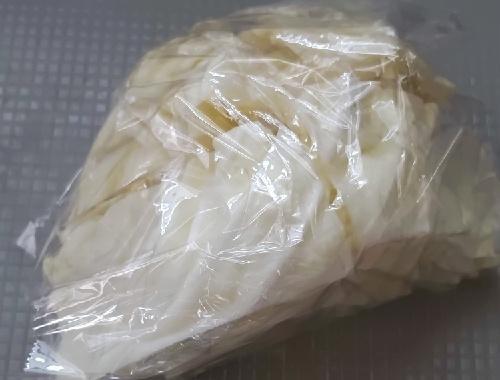 時短のため、キャベツはラップでくるみ、600Wの電子レンジで1分ほど加熱する。電子レンジから取り出したら、そのまま粗熱を取る。