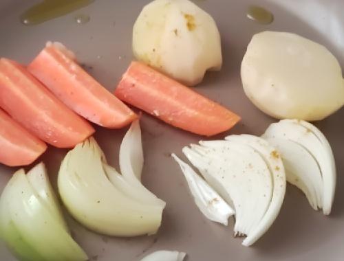 フライパンにオリーブオイルと、おろしにんにくをひき、中火にかける。そこに、人参、じゃがいも、玉ねぎを乗せて軽く焼き目をつける。