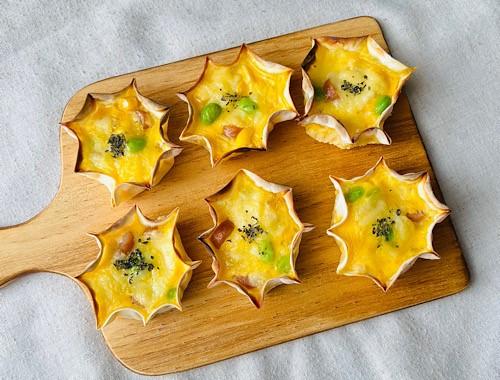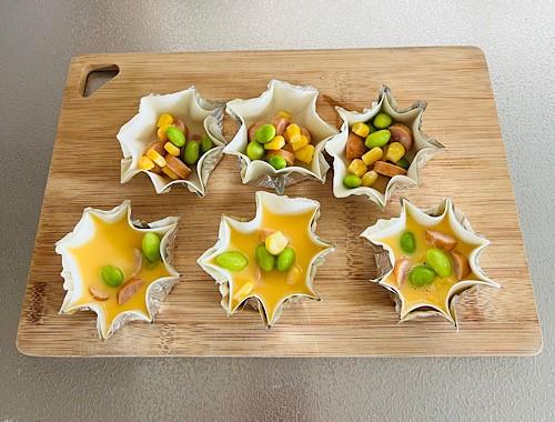アルミカップに餃子の皮を入れる。形を整えて、ウインナー、冷凍枝豆、冷凍コーンを入れ、卵液を注ぐ。