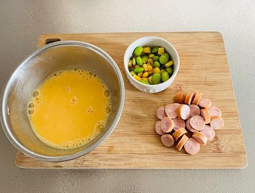 ウインナーは薄い輪切りにする。冷凍枝豆と冷凍コーンは解凍しておく。ボウルに卵、豆乳、塩コショウを入れ混ぜる。