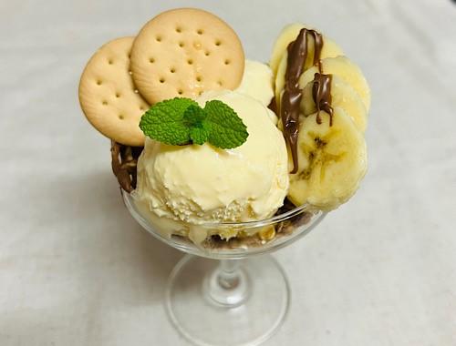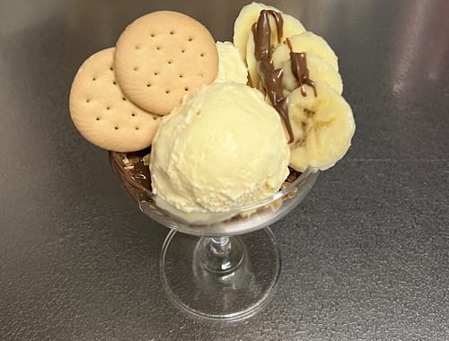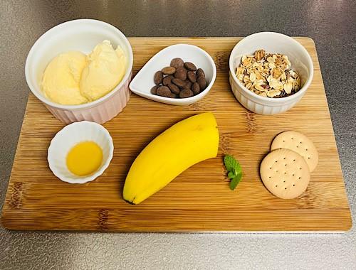 器にフルーツグラノーラを入れる。バニラアイスクリームをのせ、横にバナナをおき、ビスケットを飾る。お好きなところにチョコレートをかけ、さらに全体にラム酒もかける。
