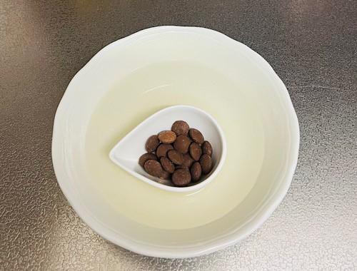 お皿やボウルに湯をはり、チョコレートを溶かす。このとき、湯がチョコレートに入らないように注意しよう。