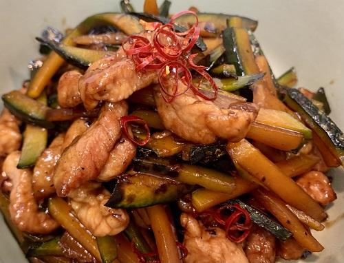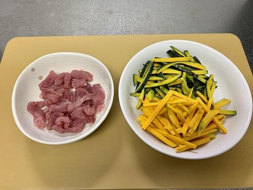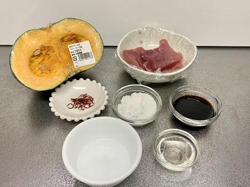 かぼちゃは種をスプーンでこそげ取り、皮をやや厚めにむく。今回、500g程度の小型のかぼちゃを使ったが、皮の重量は約90g。残りは実の部分を60g程度取り、それぞれ7~8mm程度の細切りにする。600wの電子レンジで1分加熱する。豚肉は1cm程度の細切りにし、片栗粉小さじ1(分量外)をまぶす。砂糖以外の調味料はすべて混ぜ合わせておく。