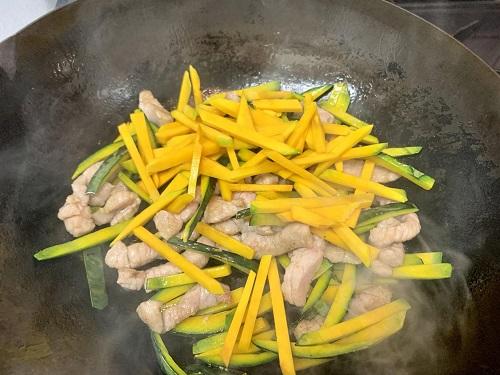 豚肉の色が変わったら、まずかぼちゃの皮、次に実の部分を炒め合わせる。火がある程度通っているので、混ぜながら炒めているとすぐにしんなりしてくる。