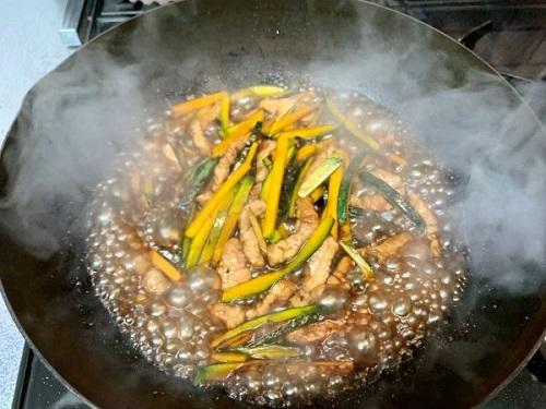 かぼちゃがしんなりしてきたら、まず砂糖を一度に加える。砂糖の照りが出てきたら、砂糖以外の調味料を一度に加える。火力は強火のまま、水分がほとんどなくなるまで炒める。かぼちゃの歯ざわりが残っている程度の仕上がりがよい。炒め時間は1分弱。