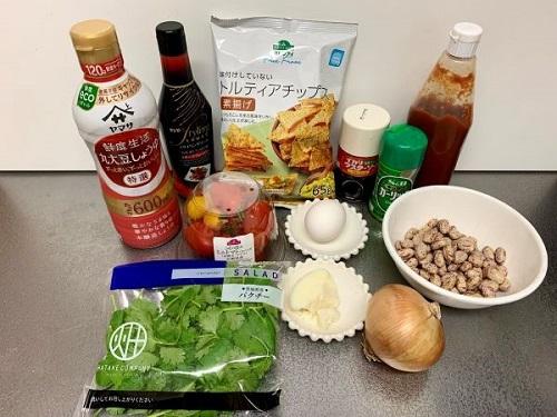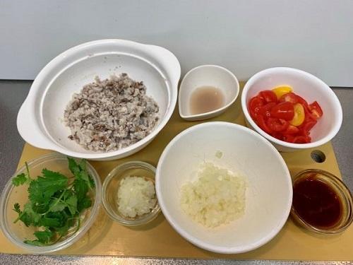 玉ねぎはみじん切りにし、サルサ用に50g、シーズニング用に20g取り分ける。コリアンダー(パクチー)は水で洗って食べやすい大きさに切る。トマトは種を取り、一口大に切る。バーベキューソースの材料はすべて混ぜておく。