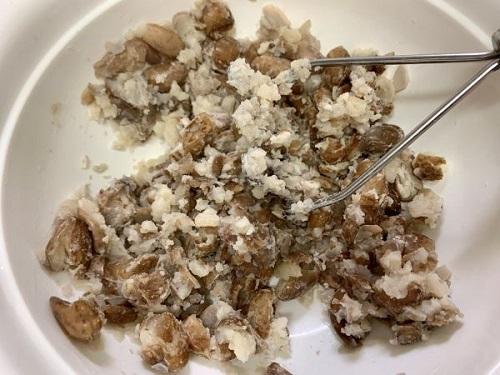 Step.1 うずら豆を茹でて粗つぶしする。