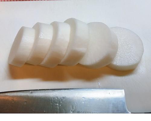 大根は皮を薄く剥き、2~3cm程度の輪切りにする。表面に切れ目を入れておく。