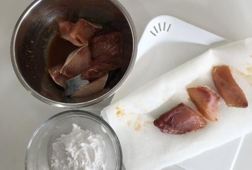 ハマチを取り出し、キッチンぺーパーで余分な調味液を抑えながら取り、片栗粉をまぶす。