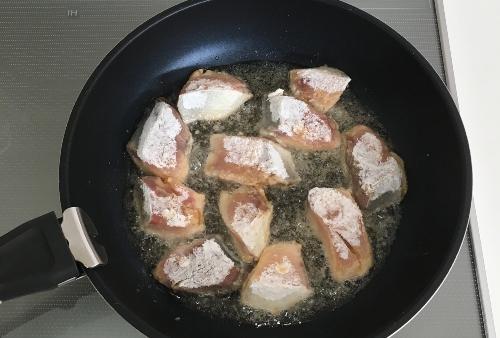 フライパンの底に5mmほどサラダ油を入れ、180度に温まったら片栗粉をまぶしたハマチを入れて両面に焼き目が付くまで揚げ焼きにする。