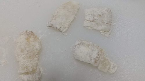 刺身用のヒラメなので薄い。唐揚げにしてもすぐに火が通るので、好きな大きさに切る。