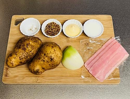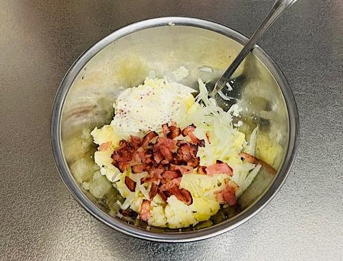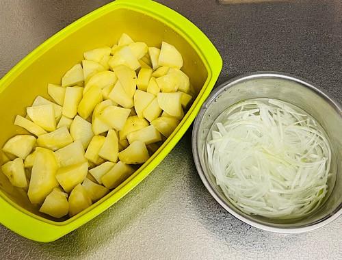 じゃがいもは皮を剥き一口大に切る。耐熱皿に入れてふんわりとラップをかけ、600Wの電子レンジで5分加熱する。加熱が終わったら熱いうちに潰し、粗熱をとる。玉ねぎは皮を剥いて端を落とし、スライサーで薄切りにしたら、15分程度水につける。15分経ったら水を捨て、水分を除く。