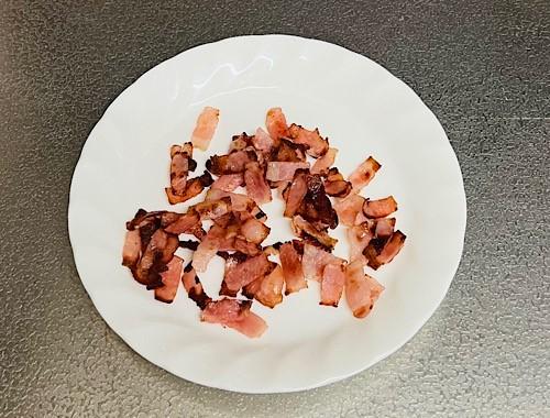 ベーコンは縦半分に切る。さらに横5mm幅に切りフライパンで焼く。カリカリになったら火を止め、粗熱をとる。