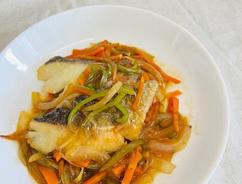 たらを取り出したフライパンを使用する。キッチンペーパーで余分な油を拭き取る。野菜をしんなりとするまで炒める。しんなりしたら★を加え、ひと煮立ちさせる。水溶き片栗粉を溶く。