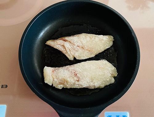 たらに小麦粉を全面にまぶす。フライパンを中火にし油を引く。たらの皮面から焼き、火が通ったら裏返す。全体が焼けたら一度取り出しておく。