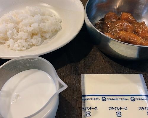 小鍋にカレーと牛乳を入れて、中火にかける。沸騰してきたら弱火にしてスライスチーズを入れ、溶けるまで混ぜる。鍋底が焦げつきやすいので、気をつけながら混ぜるようにする。