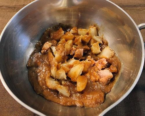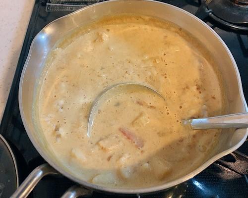 カレーの具材を、キッチンバサミなどを使いカットする。そうすることで、牛乳やチーズとの絡みがよくなる。
