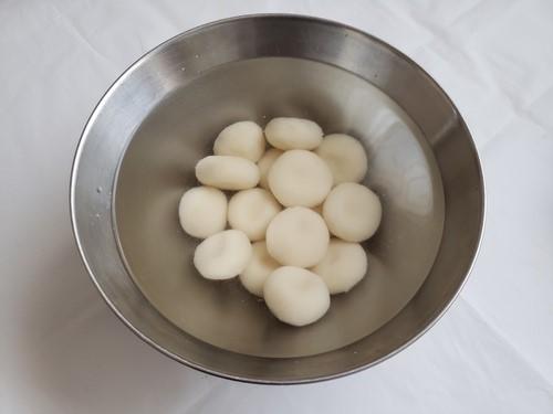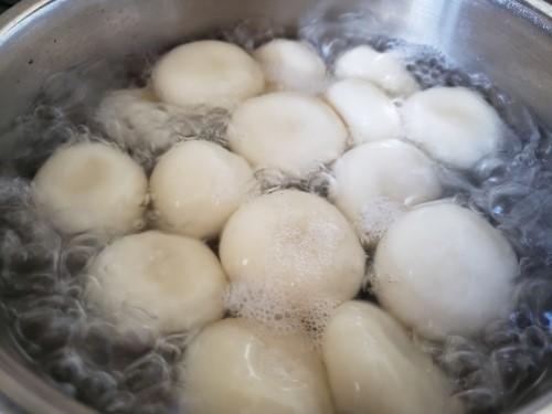 一口大で丸めて、手のひらで団子を軽く押さえて真ん中にくぼみを作る。鍋にお湯を沸騰させ、中火で茹でる。