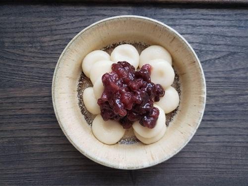 水を切って団子をお皿に盛り付け、あんこをトッピングしてできあがり。