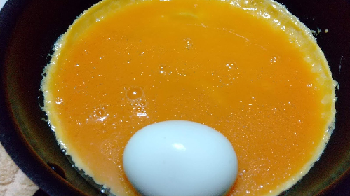 卵4個をよく溶いてその中に砂糖、塩を入れてよく混ぜる。オムレツはこの卵液が滑らかだと上手に焼ける。フライパンに油をしき、中火に熱して卵液を入れる。下面が焼けてきたなと思ったら、茹で卵を投入してオムレツを半分に折る。火を弱めて、ゆっくりと焼きながら少しずつフライパンを振って、オムレツ形になるようにする。オムレツの側面が満遍なく焼けるように、フライ返しを使いながら極弱火で焼いていく。