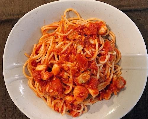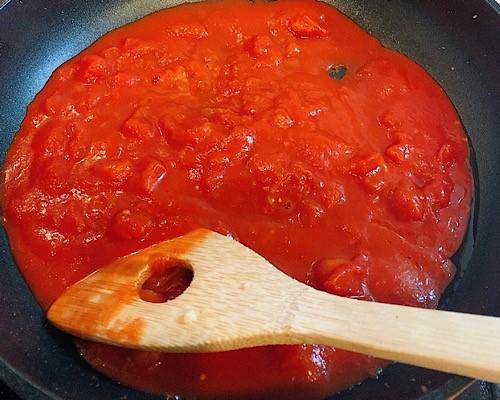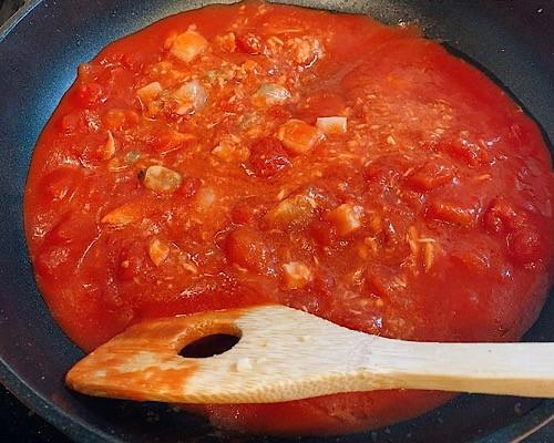 フライパンにオリーブオイルをひき、にんにく、トマト缶とパスタの茹で汁を入れて中火で加熱する。コンソメ顆粒と塩で味を調える。