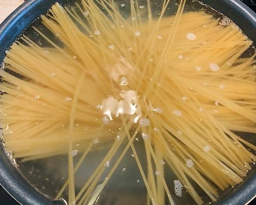 鍋やフライパンなどに湯をたっぷりと沸かして塩をひとつまみ加えてから、パスタを入れて中火で茹でる。表示時間よりも1分短く茹でるようにして、茹で汁を1/4カップ程度とっておく。