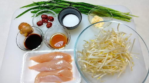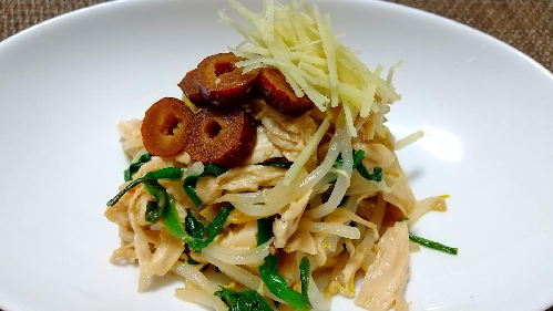 鶏肉ささみは筋を除いて適当に好みの大きさに割き、ニラなどが入ったボウルにいれる。調味料も全てボウルに入れてよく混ぜ合わせる。器に盛り付けて、上から針生姜とナツメを飾ったら完成。