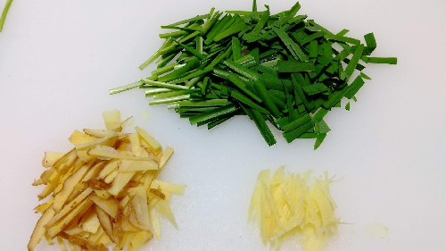 ニラは根元を落とし、ザクザクと5等分程度に切る。生姜は千切りにする。生姜の3分の1程度は、仕上げの飾り用にしたいので針生姜にしておく。