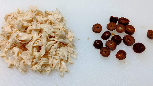 お湯を沸かして沸騰させたら鶏肉ささみを入れる。弱火で10分茹でたら火を止める。そこにナツメを入れて蓋をして余熱で10分程度おく。ささみはパサつきやすいので火の入れ方に注意したい。余熱を利用して火を入れたら蓋を取る。粗熱がとれるまで茹でた水の中に入れておくとしっとり仕上がる。粗熱が取れたら取り出す。ナツメは5mm程度の輪切りにして飾り用にする。