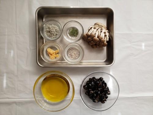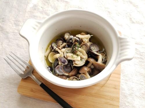 オリーブオイルが沸騰してきたら、和えておいたしらすと塩、しじみ、しめじを入れる。そのまま弱火で10分程度ゆっくり煮込む。