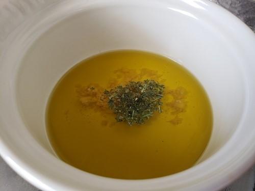 鍋にオリーブオイル、にんにく、ドライバジルを入れて弱火にかけて香りを立たせる。