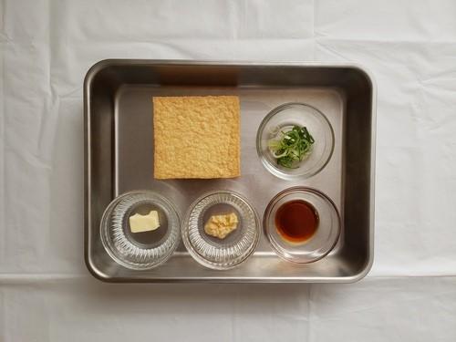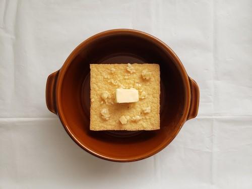厚揚げを耐熱皿に入れ、ニンニクとバターをのせる。