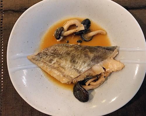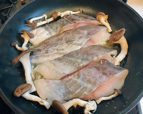 タラの周りにひらたけを加えて、酒を回し入れてふたをして、3分程度中火で蒸し焼きにする。
