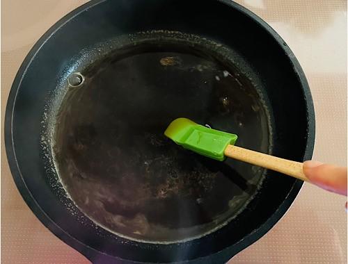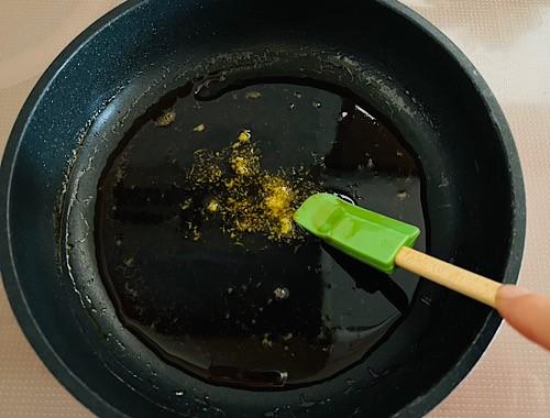 ゆずをしぼり、種を除く。フライパンにゆずのしぼり汁、調味料を加える。火にかけて、強火で沸騰させる。