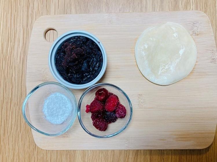 お皿に盛り付ける。フルーツとあんこを餃子の皮に乗せて、手で巻いて食べる。