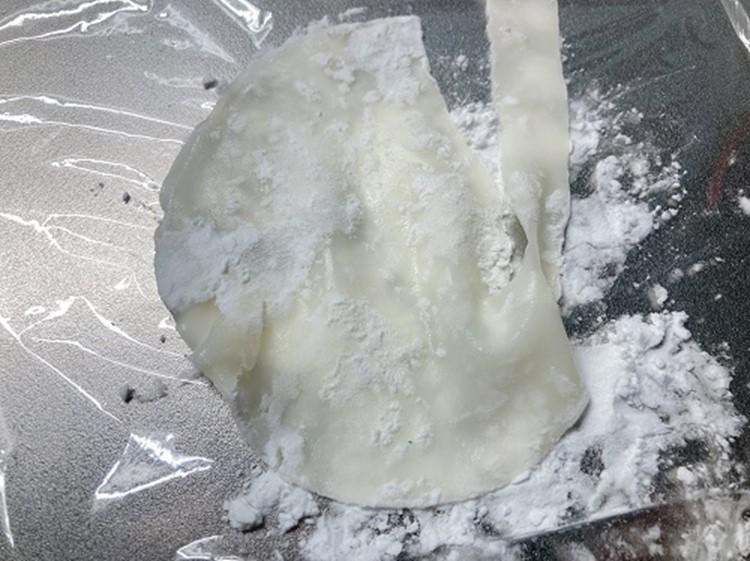 餃子の皮の水気をキッチンペーパーで切る。片栗粉をラップの上に広げ、餃子の皮に軽くまぶしていく。