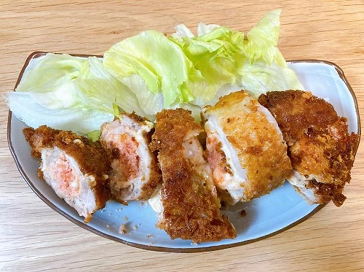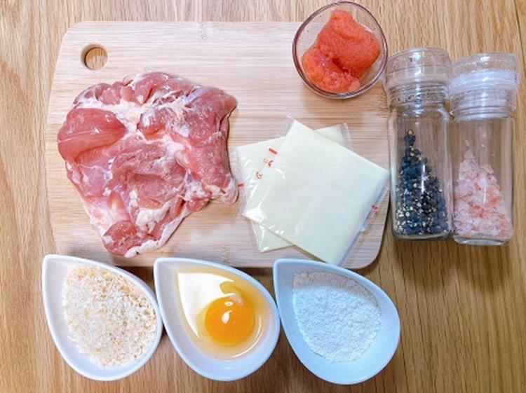 明太子をほぐして、スライスチーズとともに鶏もも肉にのせる。端に寄せて、きつめにまいておく。巻き終わったら、形が崩れないようにラップでくるみ、常温で少し置いておく。